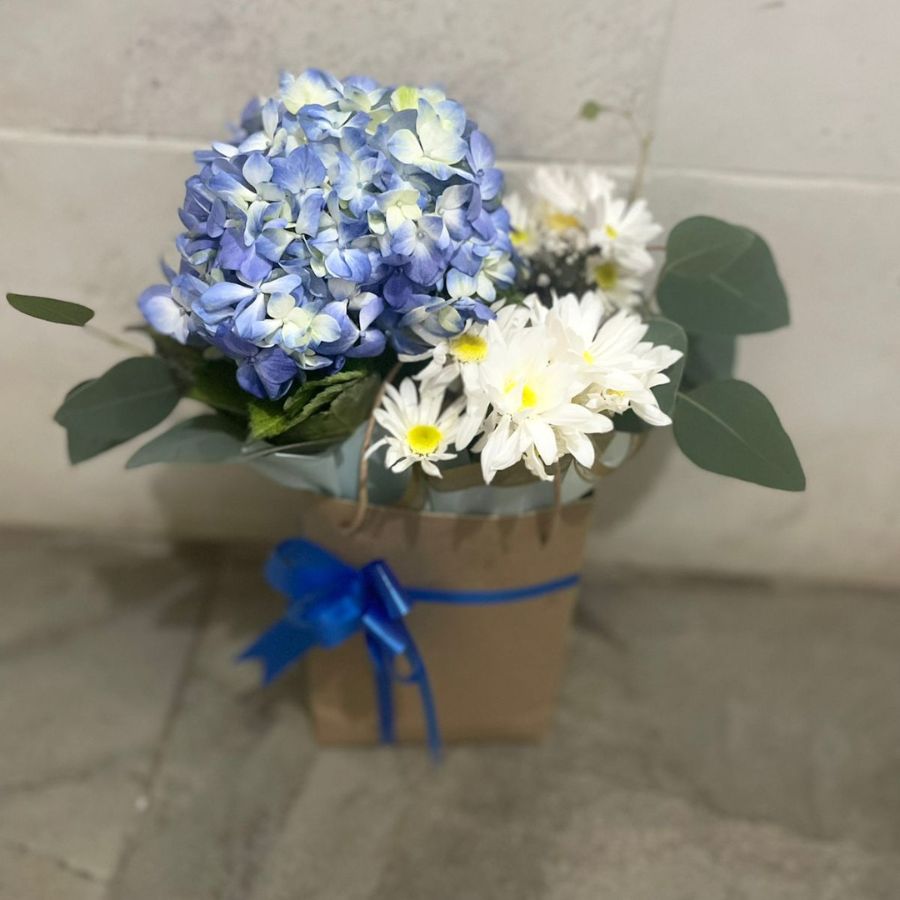 Bolsa de regalo con hortencuas y margaritas