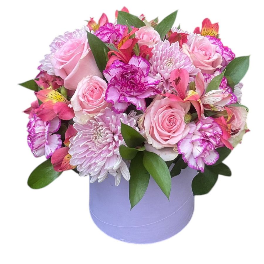 Caja floral con rosas y claveles 25 cm de alto aprox
