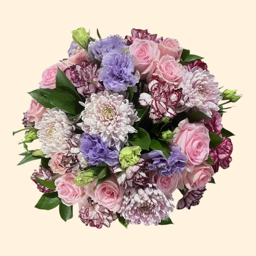 Caja Floral Rosas, clavel, lisianthus. 25 cm de altura aprox