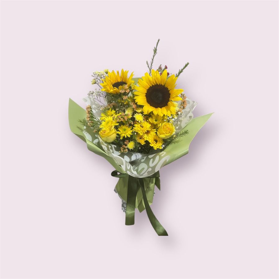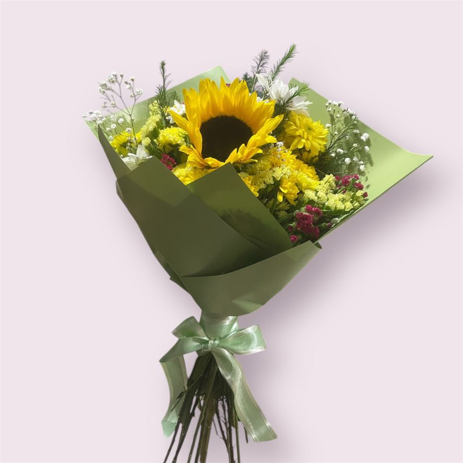 Ramo con girasol, rosas y crisantemos